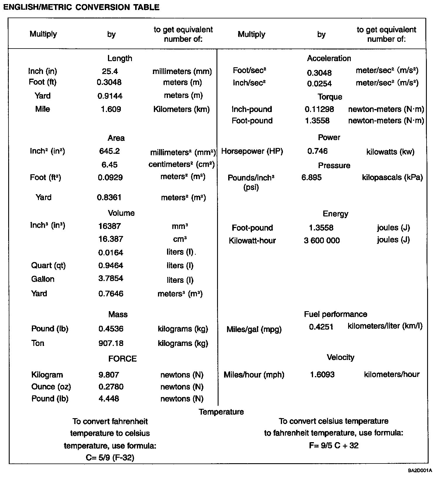 English/Metric Conversion Table