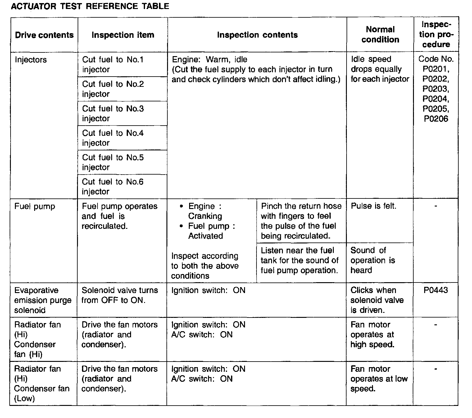 Actuator Test Reference Table: