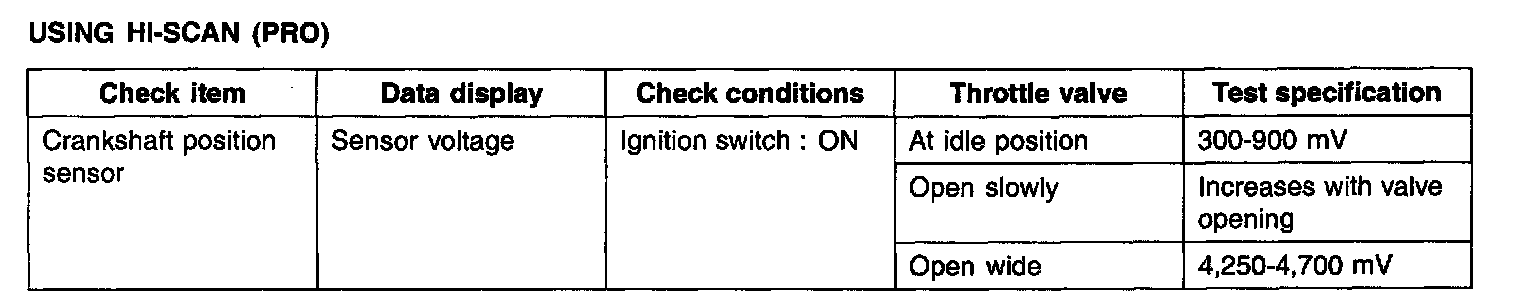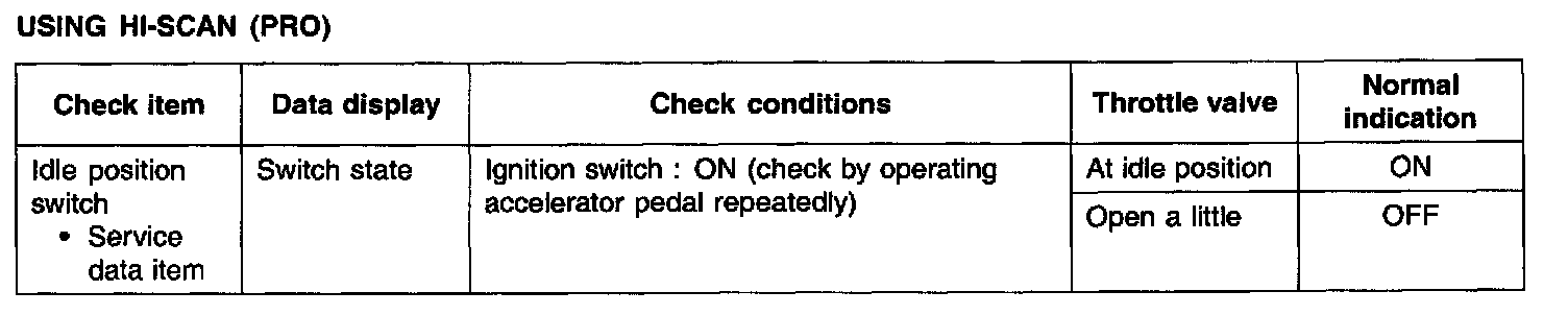 3. Turn the ignition switch to the ON position (do not start engine) and check that TPS output voltage is as specified. If a HI-SCAN (PRO) is used, read the TPS voltage.