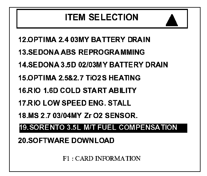 14. Select option 19. SORENTO "3.5L M/T FUEL COMPENSATION and press "ENTER".