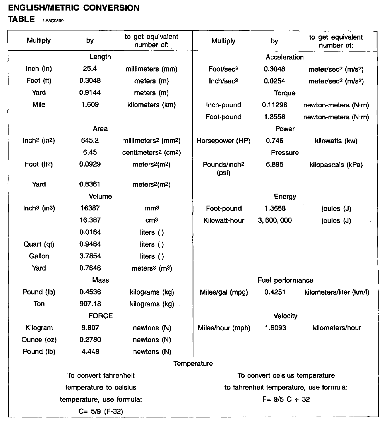 English/Metric Conversion Table: