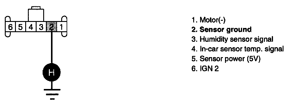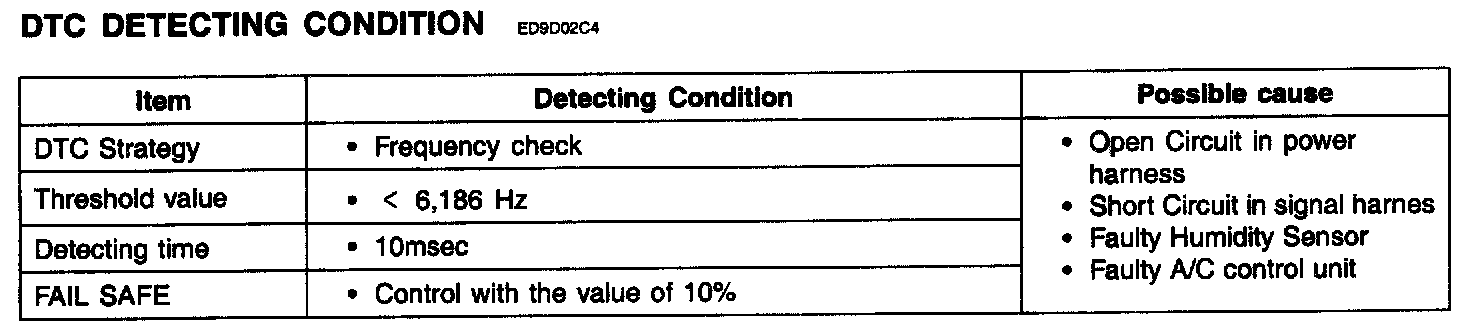 The A/C controller sets DTC B1201 if there is a short circuit in humidity sensor signal harness or the measured frequency value of sensor is less than threshold value (about 6,186 Hz)