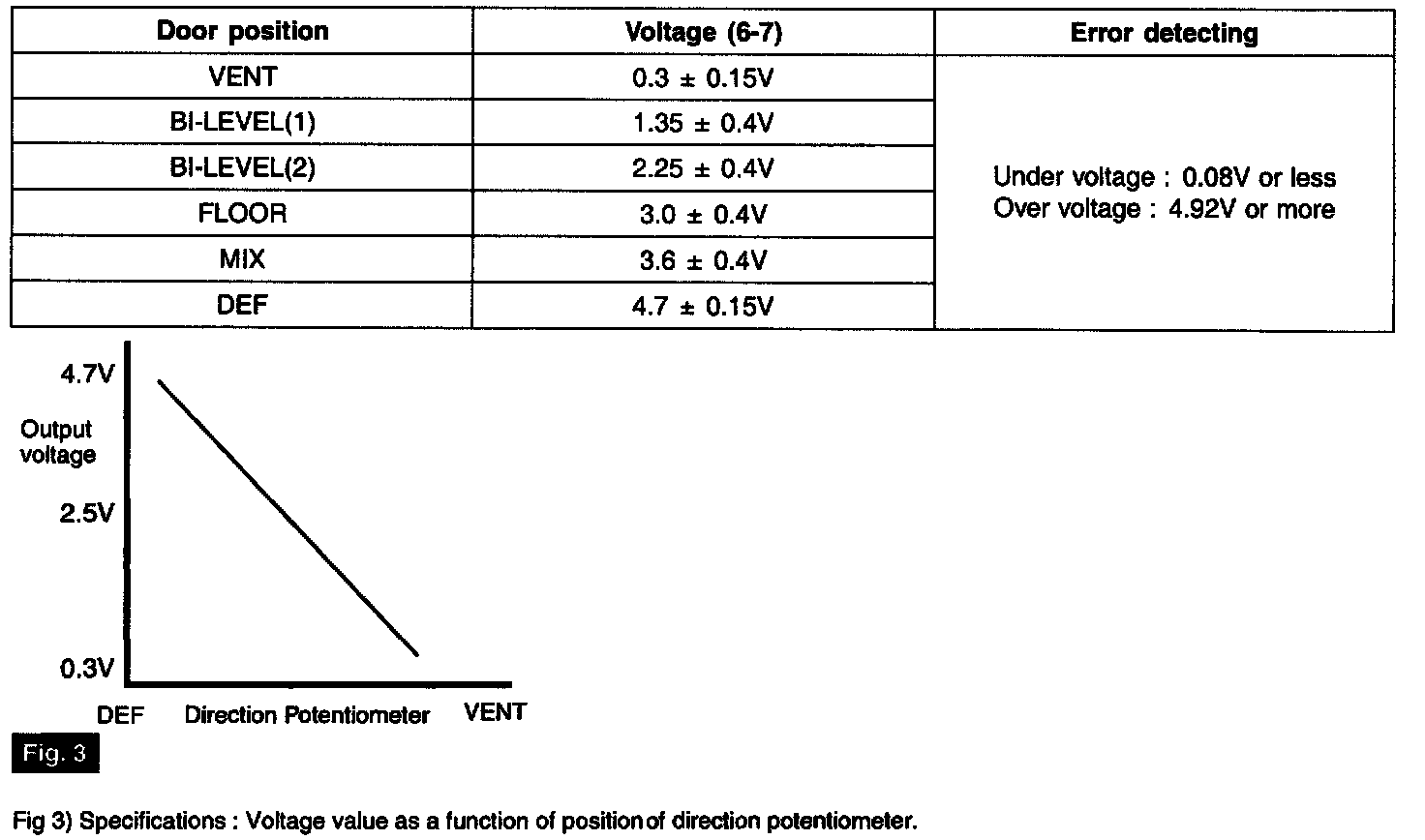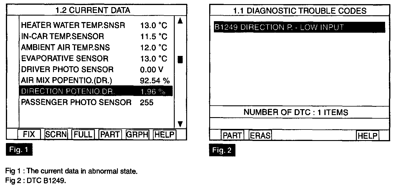 The A/C controller sets DTC B1249 if there is an open circuit or poor connection in the Direction potentiometer.