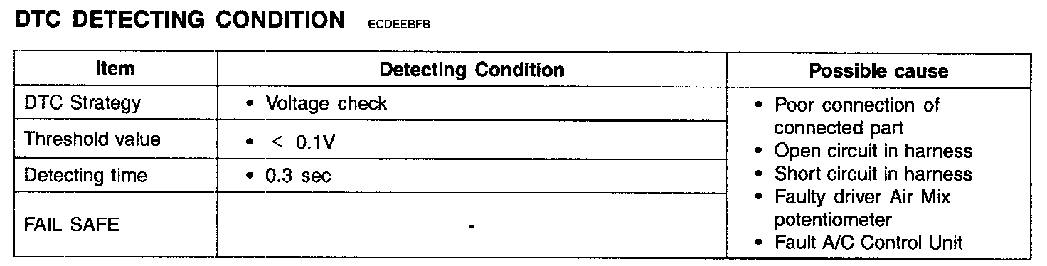 - There is any fault in Driver AIR MIX Motor. If the parameter of "Driver AIR MIX DOOR" is 30% or less when the actuator operates to the hot position, or If the parameter is 60% and more when the actuator operates to the cold position.