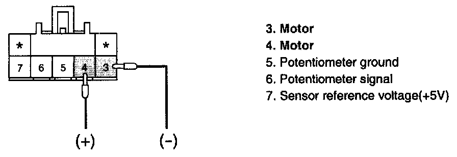 3. Verify that the temperature actuator operates to the hot position when connecting 12 V to the terminal "3" and grounding terminal "4".