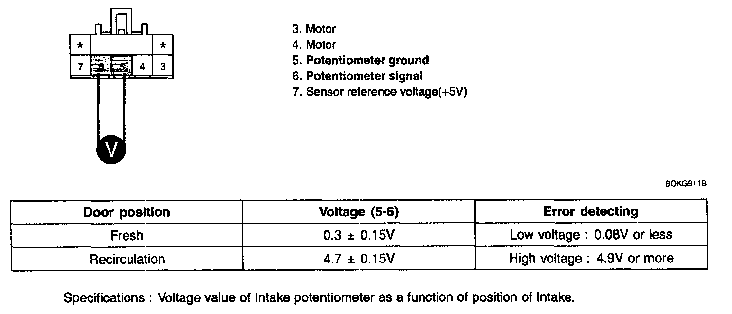 - There is any fault in Intake potentiometer. If the parameter of "Intake potentiometer" is 30% or less when the actuator operates to the fresh position, or If the parameter is 60% and more when the actuator operates to the recirculation position.