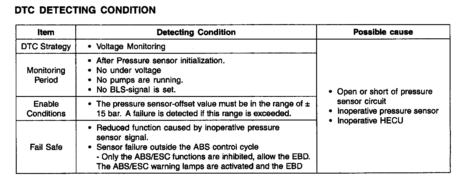With the driver torque demand and the lateral acceleration a driver braking demand is calculated. Unless the pump motor is operating or there is a brake signal, The offset compensation is executed. A failure is detected if offset value exceeded ±15 bar.