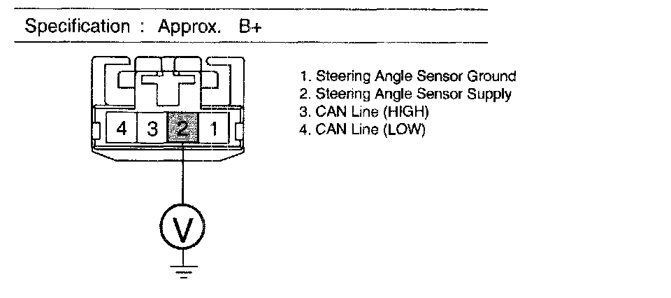 > Check for damaged harness and poor connection between the battery terminal (+) and terminal "2" of the steering angle sensor harness connector, Check for open or blown 10 A ABS fuse referring to "Circuit Diagram". Repair as necessary and then go to "Verification of vehicle Repair" procedure.