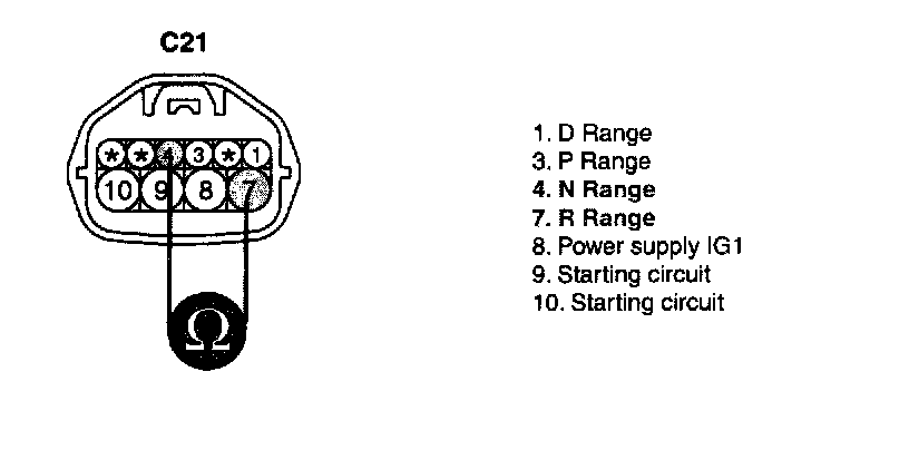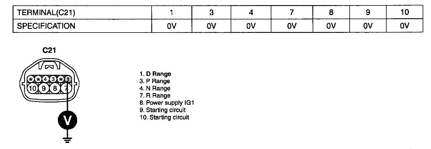 The Transaxle Range Switch sends the shift lever position information to the TCM (PCM) using a 12V (battery voltage) signal. When the shift lever is in the D (Drive) position the output signal of Transaxle Range Switch is 12V and in all other positions the voltage is 0V. The TCM (PCM) judges the shift lever position by reading all signals, for the Transaxle Range Switch, simultaneously.