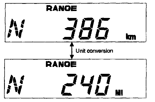 When the remaining distance is below 30 miles (50 km), a blinking "----" symbol will be displayed. The unit can be changed by press the reset button for more than 4 sec. If the unit of distance to empty is changed, the unit of average fuel consumption is changed together.