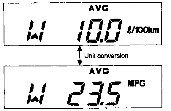 This mode calculates the average fuel consumption from the total used fuel and the distance. The meter's working range is from 0.0 to 99.9 L/100 km or MPG(mile per gallon).