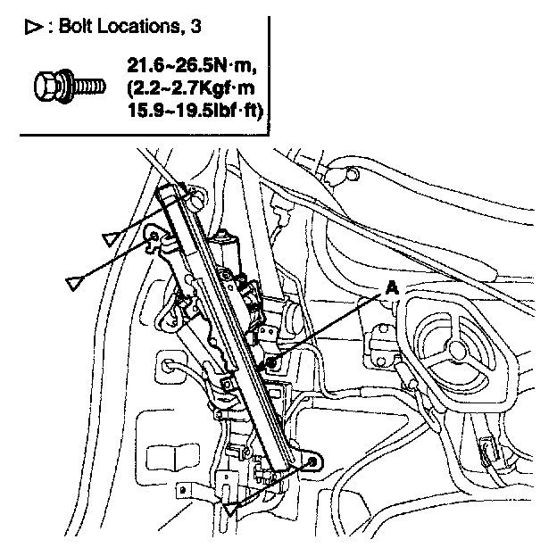 5. After loosening the mounting bolts, then remove the tailgate motor assembly (A).
