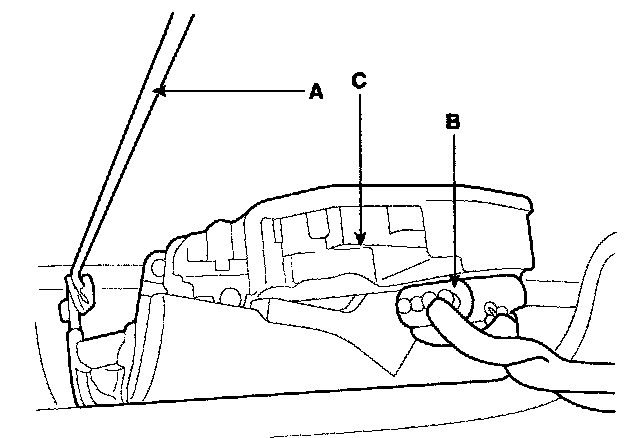 5. Remove the tail gate handle rod (A) and connector (B) from the cinching latch assembly (C).