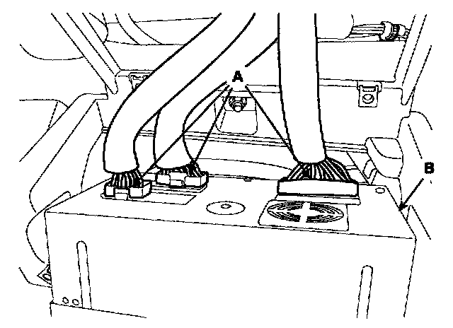 3. Disconnect the connector (A), then remove the audio assembly (B).