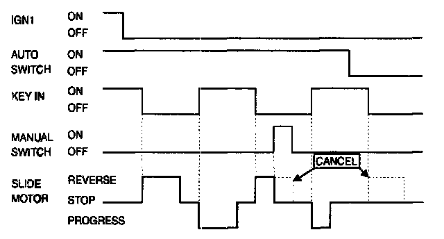 1. When IG is off (CAN BUS data IG transmitted from IPM is "off") and a key is removed (CAN BUS data Key Reminder Switch transmitted from IPM is "off"), and if "ID1" or "ID2" is received during keyless unlock operation, it automatically adjusts seat and pedal positions as memorized in keyless code (there is no buzzer output during preset recall operation by keyless). However, seat slide adjustment position is determined as follows, depending on Auto switch.