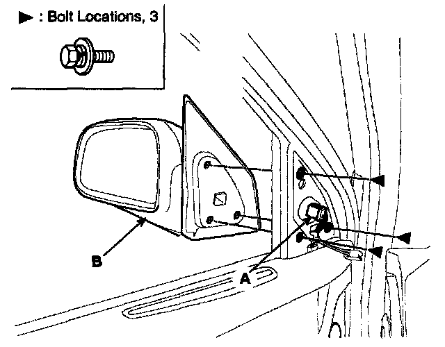 3. After disconnecting the connector (A), remove the outside rear view mirror (6).