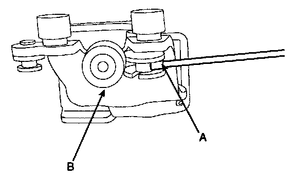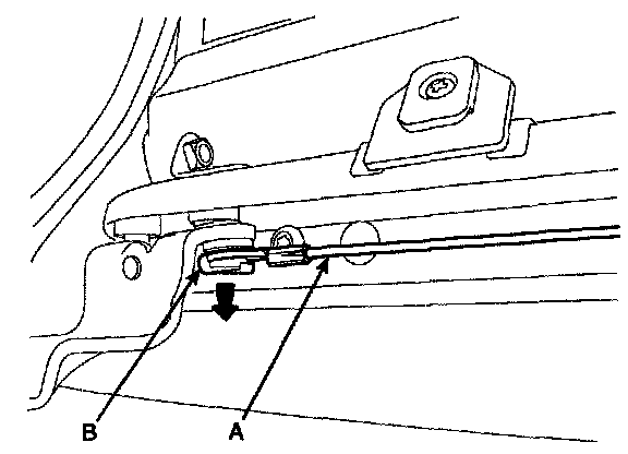 8. Remove the front cable (A) from center roller hinge (B).