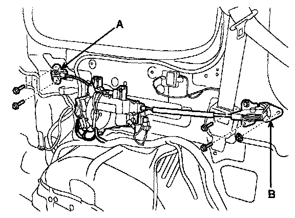 6. Pull the rear cable (A) and draw the cable clip (B) to bottom of roller hinge post and then remove the rear cable (A).