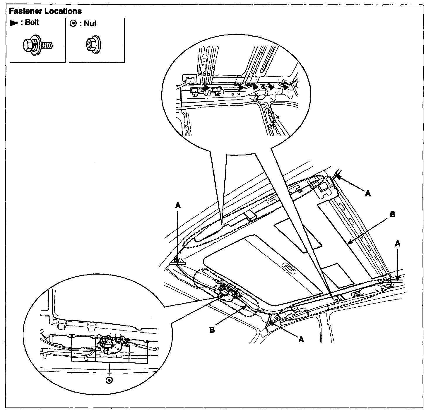 3. After loosening the mounting bolts and nuts, remove the sunroof assembly (B).