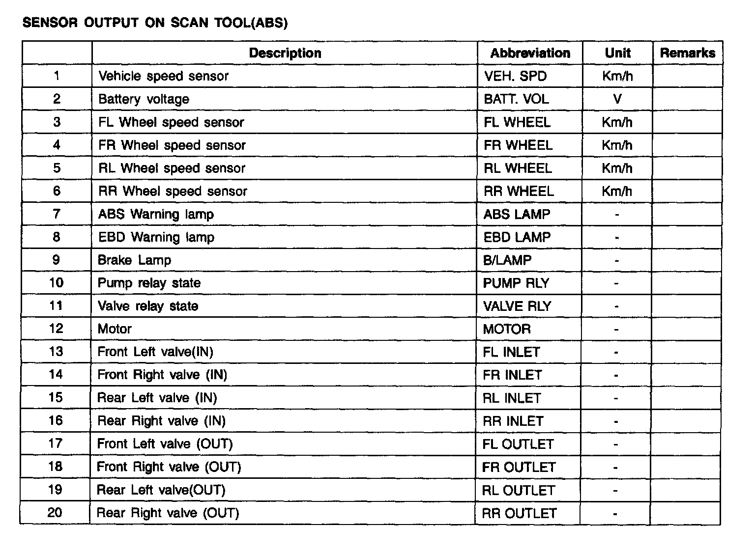 SENSOR OUTPUT ON SCAN TOOL (ABS):