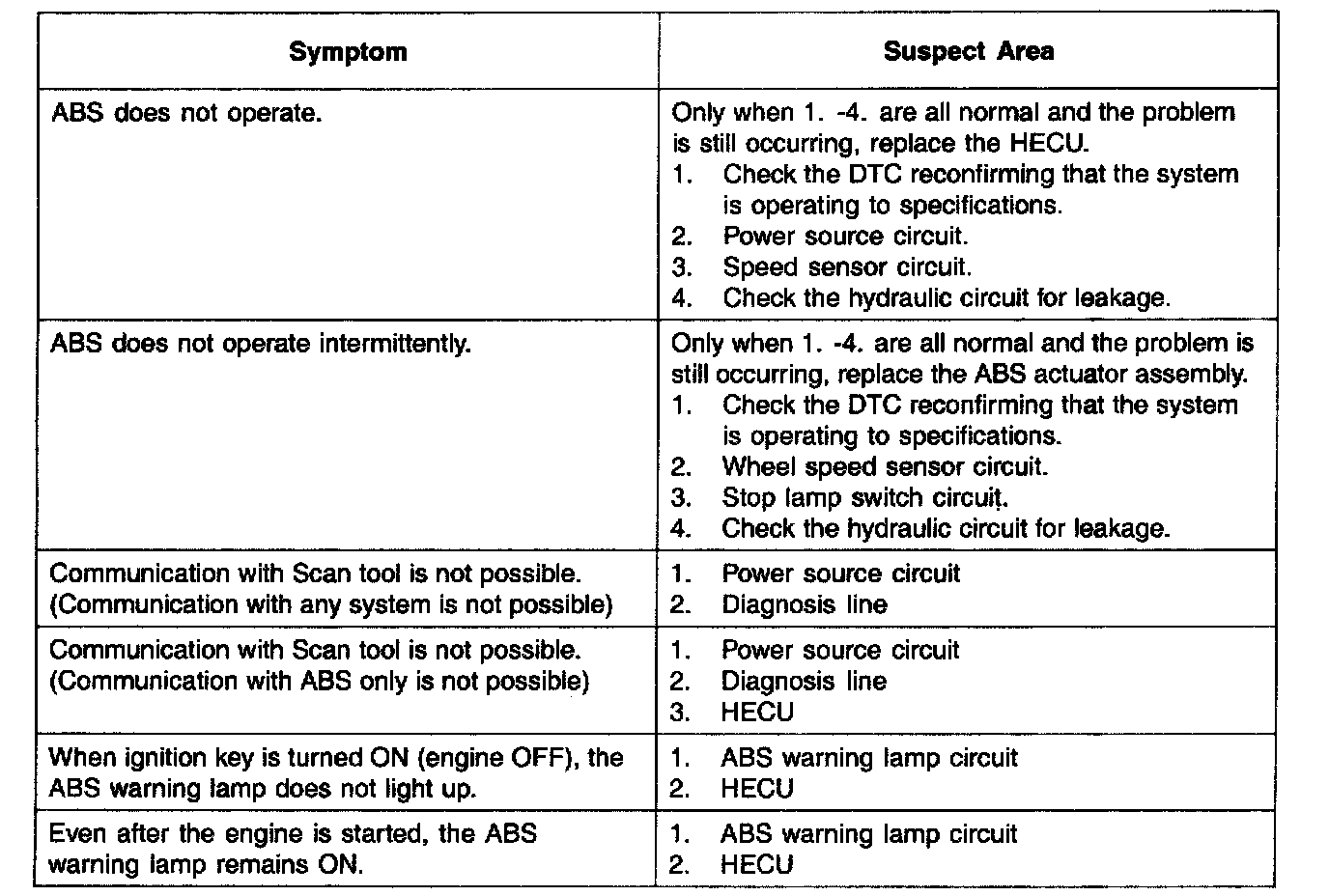 PROBLEM SYMPTOMS TABLEIf a normal code is displayed during the DTC check but the problem still occurs, check the circuits for each problem symptom in the order given in the table and proceed to the relevant troubleshooting page.