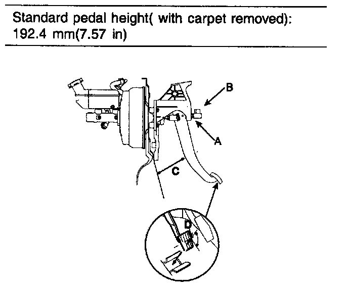 2. Lift up the carpet. At the insulator cutout, measure the pedal height (C) from the middle of the left-side center of the pedal pad (D).