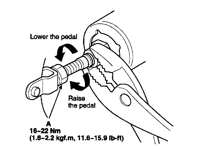 3. Loosen the pushrod locknut (A), and screw the pushrod in or out with pliers until the standard pedal height from the floor is reached. After adjustment, tighten the locknut firmly. Do not adjust the pedal height with the pushrod depressed.