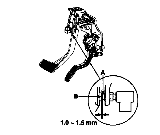 Screw in the brake switch until its plunger is fully depressed (threaded end (A) touching the pad (B) on the pedal arm) then brake off the switch 3/4 turn to make 1.0 - 1.5 mm (0.04 - 0.06 inch) of clearance between the brake switch connector. Make sure that the brake lights go off when the pedal is released.