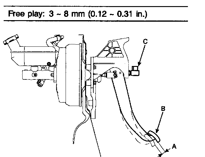 2. If the pedal free play is out of specification, adjust the brake switch (C). If the pedal free play is insufficient, it may result in brake drag.