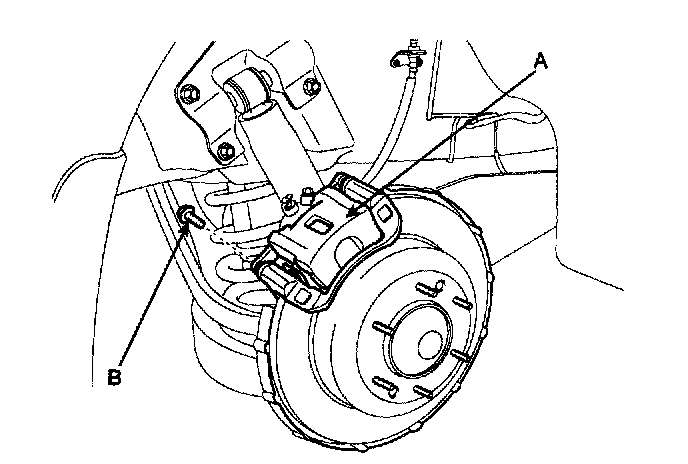 2. Remove the guide rod bolt (B), After raising the caliper assembly (A), support it with a wire.
