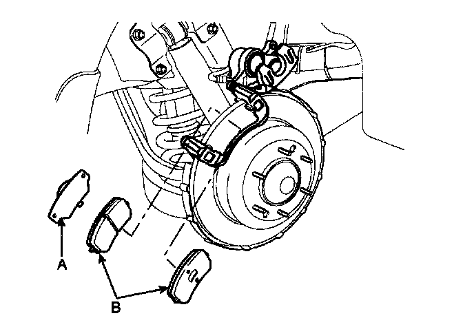 CAUTION: If you reuse the pads, check for foreign material between the pad shim (A) and the back of the pads (B) and reinstall the brake pads in their original position to prevent a momentary loss of braking efficiency.