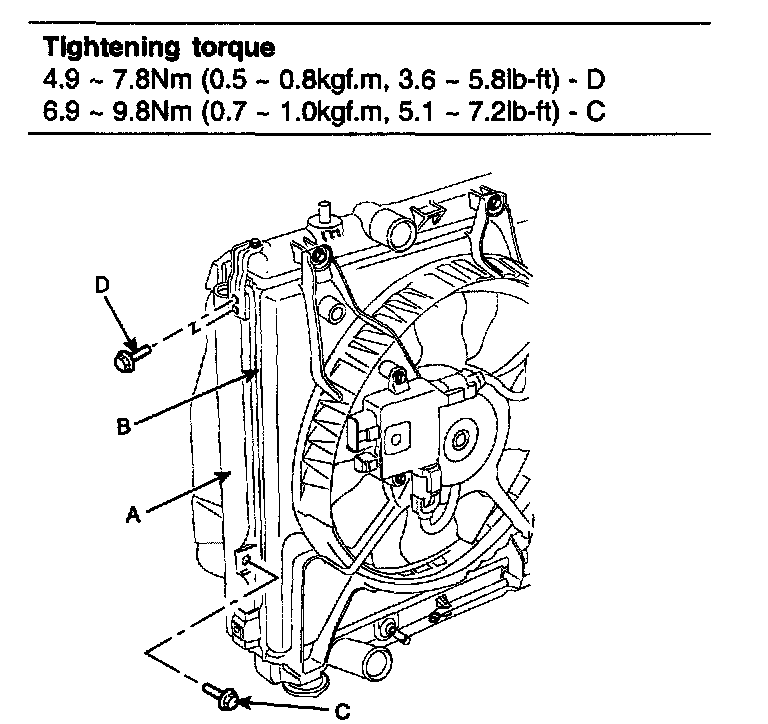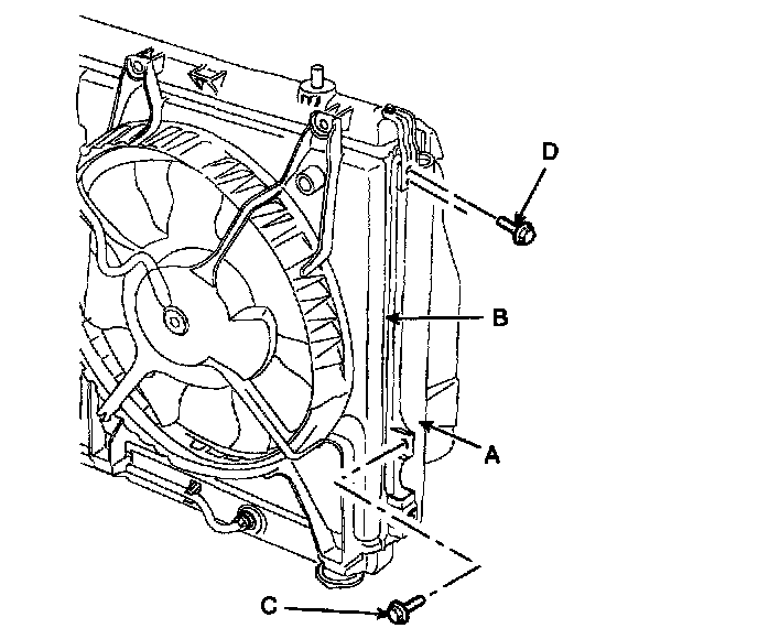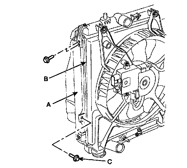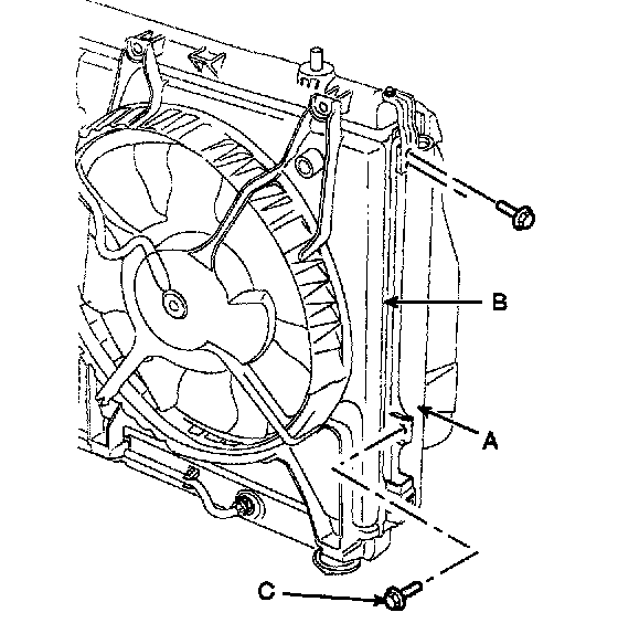 8. Separate the condenser (A) from the radiator assembly (B) by removing the bolts (C).