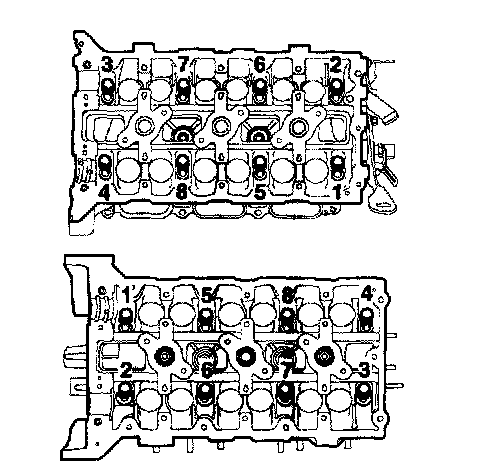 1) Uniformly loosen and remove the 16 cylinder head bolts, in several passes, in the sequence shown. Remove the 16 cylinder head bolts and plate washers.