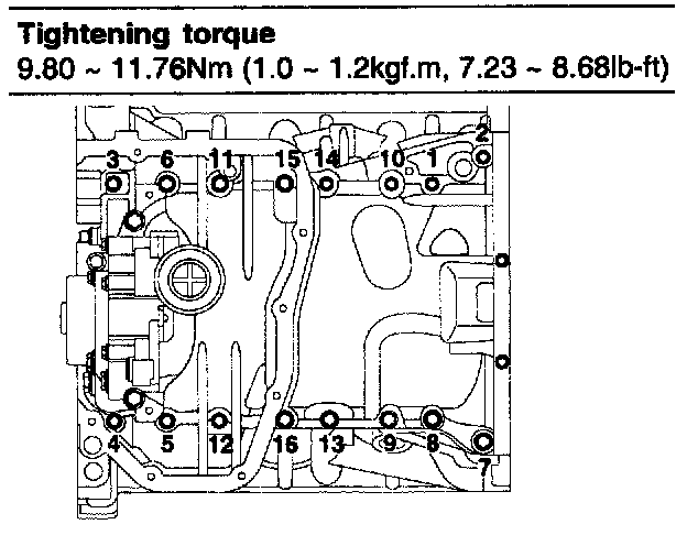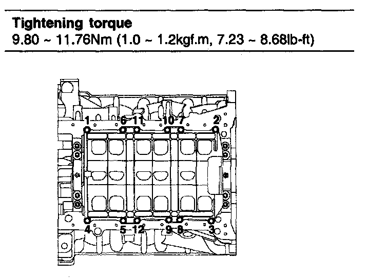 1) Install and uniformly tighten the bearing cap bolts, in several passes, in the sequence shown.