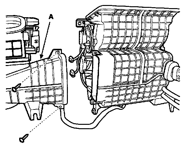 5. Remove the blower unit (A) from the heater unit after loosening a mounting bolt and 2 screws.