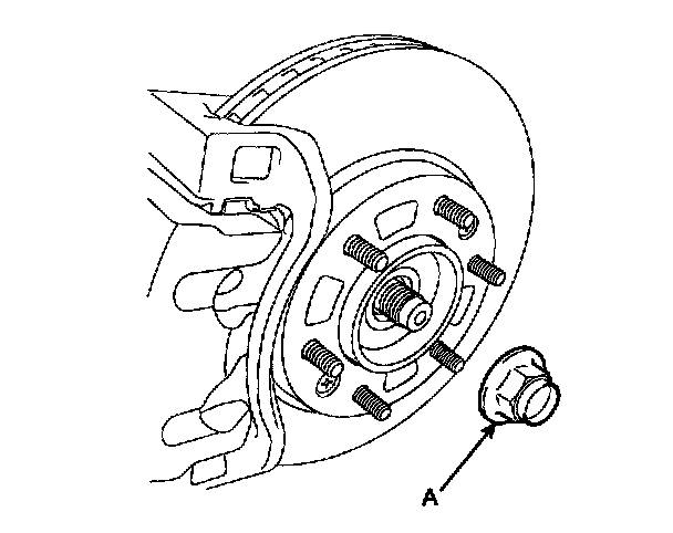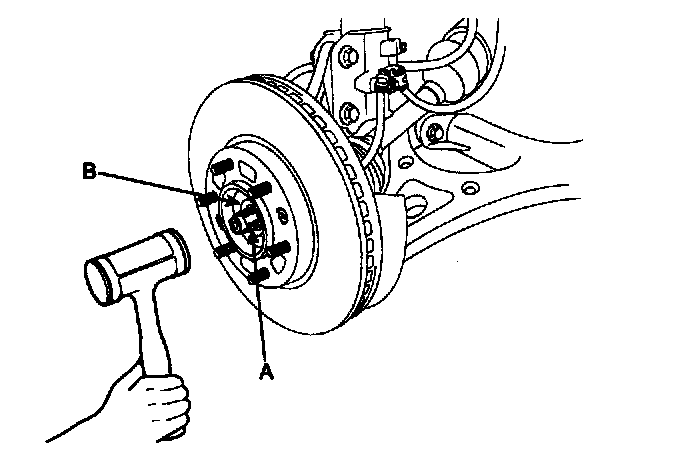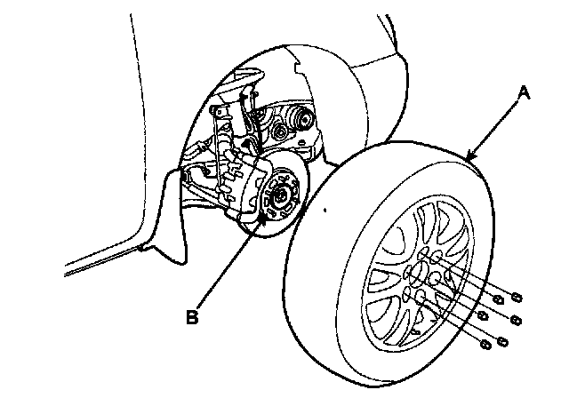1. Raise the vehicle and remove the wheel & tire assembly (A) from the front hub assembly (B).