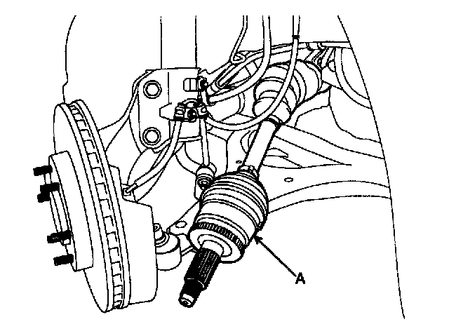 10. Using a plastic hammer, disconnect the driveshaft (A) from the front hub assembly (B).