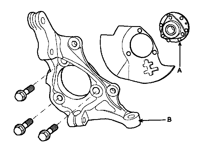 1. Separate the hub & bearing assembly (A) from the knuckle (B) by loosening the bolts.