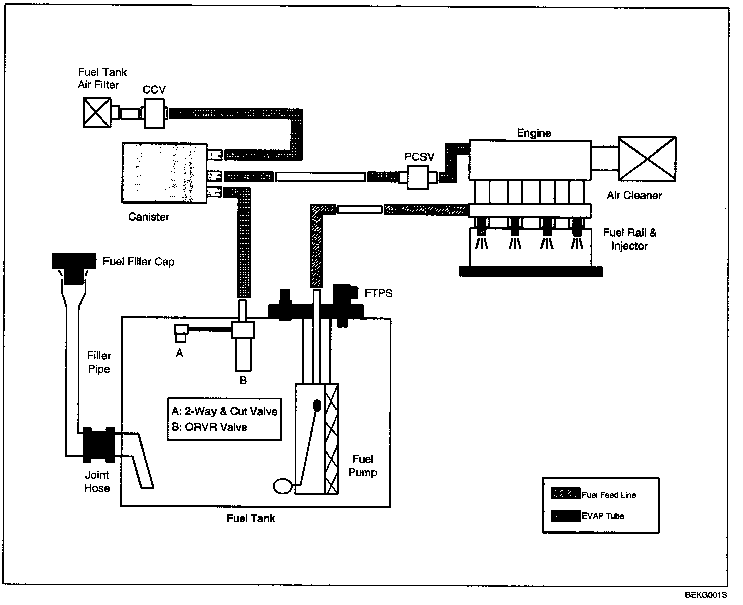 Evaporative Emission Control System prevents fuel vapor stored in fuel tank from vaporizing into the atmosphere. When the fuel evaporates in the fuel tank, the vapor passes through vent hoses or tubes to the canister filled with charcoal and the canister temporarily holds the vapor in the charcoal. If ECM determines to draw the gathered vapor into the combustion chambers during certain operating conditions, it will use vacuum in intake manifold to move it.