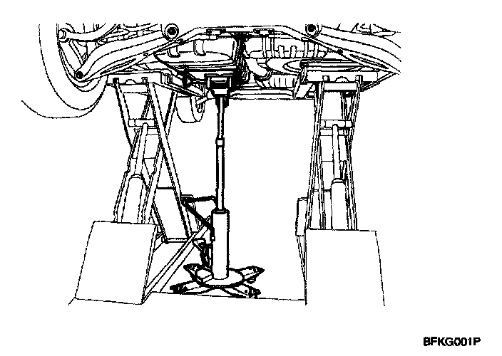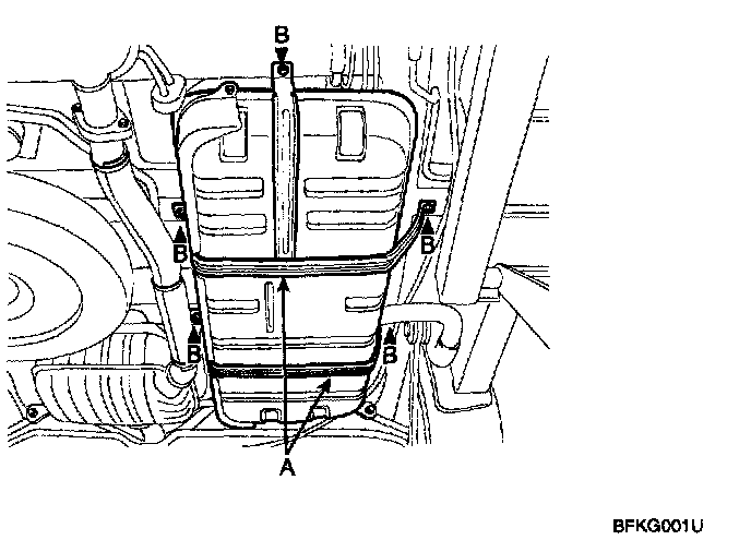 6. Remove the fuel tank band (A) with unscrewing the mounting bolts (B) and remove the fuel tank from the vehicle.