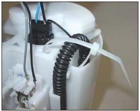 3. Install a tie wrap around the return line and through the hole of the fuel pump housing as shown in the photo.