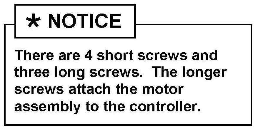 2. Remove the seven screws holding the cover and drive assembly in place. There are 4 short screws and three long screws. The longer screws attach the motor assembly to the controller.