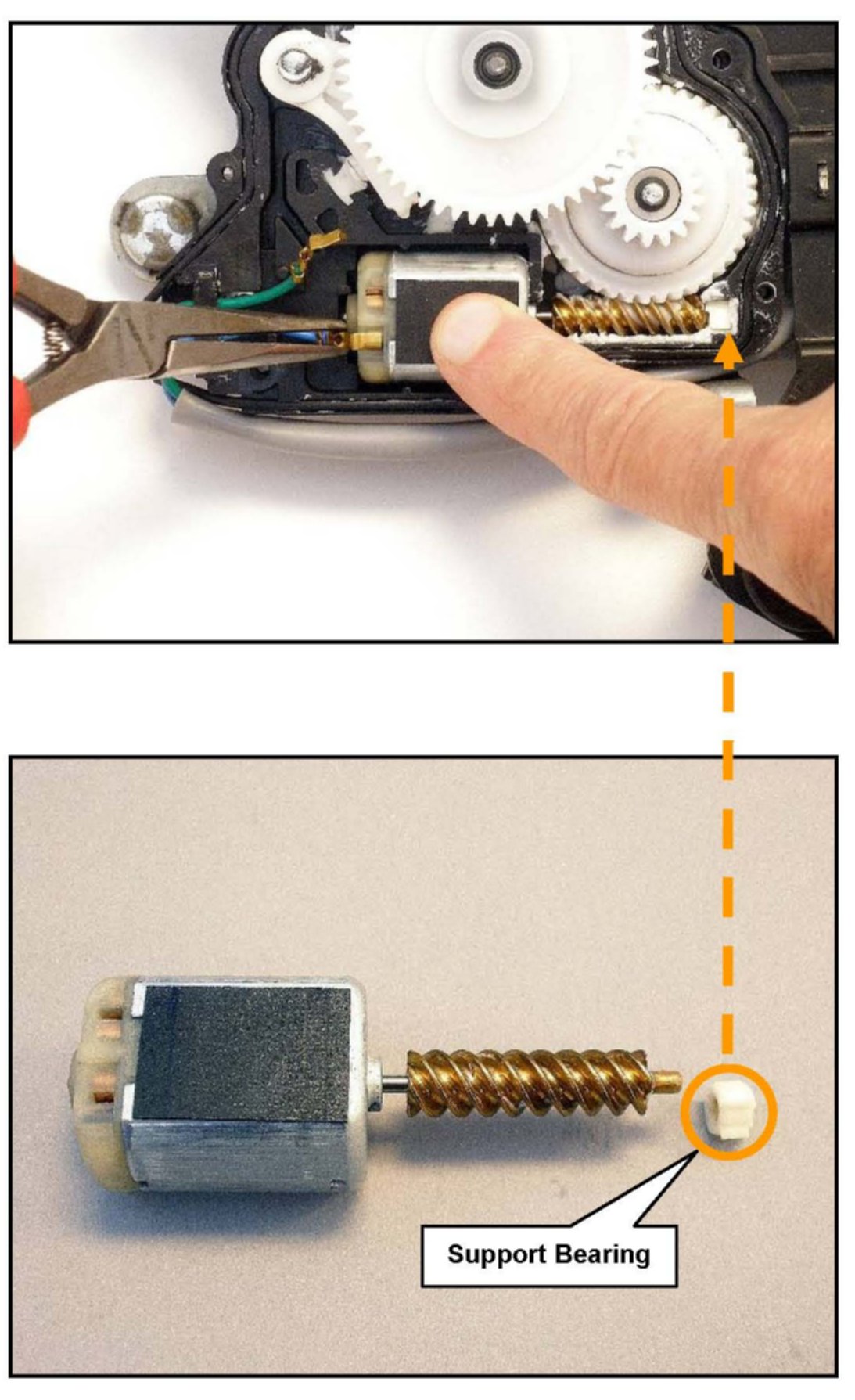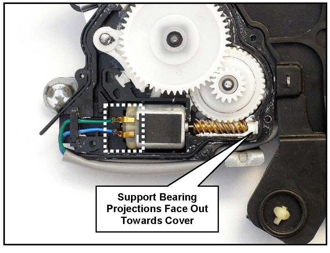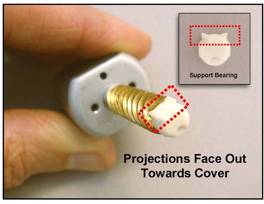 1. NOTICE While reinstalling the motor, make sure that the white nylon support bearing projections are facing out towards the cover. Failure to do this may result in noise and/or the gear damage.