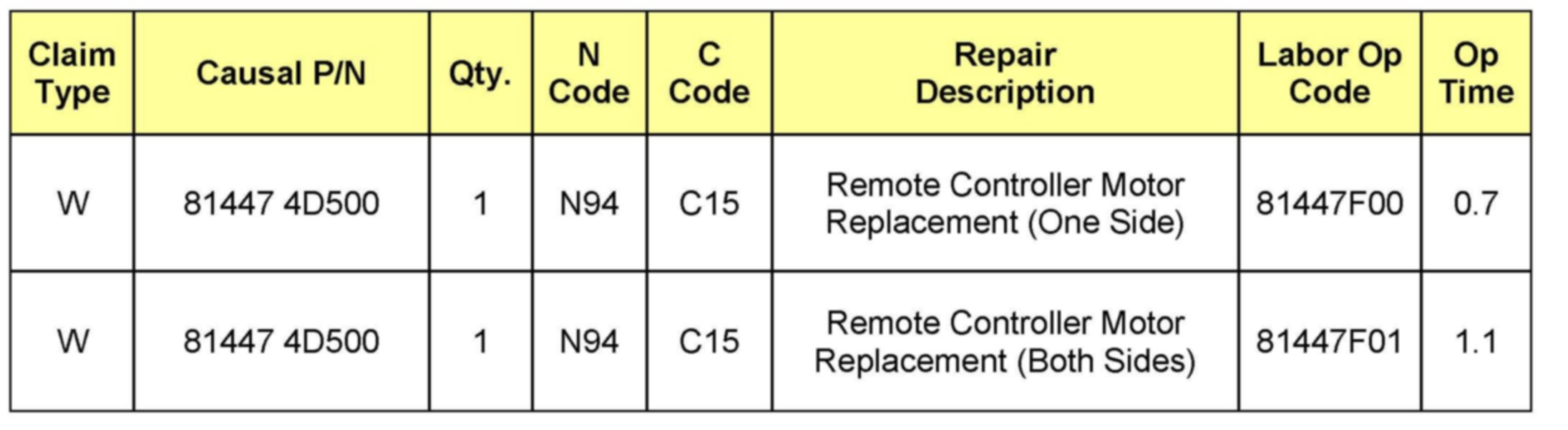 Follow the diagnostic procedure in the service information: Body Electrical System > Power Door Locks > Power Door Lock Actuator. If it is determined that the actuator motor is defective, it is only necessary to replace the actuator motor with part number 81447 4D500. Do Not replace the Remote Controller Assembly for this concern.