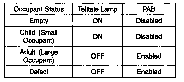 The Telltale Lamp indicates the Passenger Airbag (PAB) enabled and disabled status based on occupant status of passenger seat. If the passenger seat is empty or occupied with child (or child seat), the Passenger Airbag is disabled and the Telltale Lamp is turned ON to inform the driver that the PAB is disabled. As soon as operating voltage is applied to the SRSCM ignition input, the SRSCM activates telltale lamp prove out. Occupant status information and telltale status are as in table.