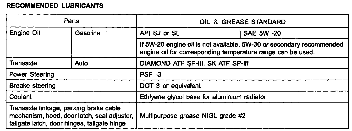 Using any other type of parts and fluid can cause serious damaged if the vehicle. RECOMMENDED LUBRICANTS.