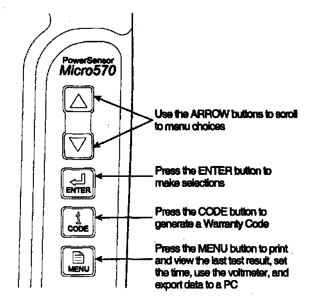 8. After the test, the MICRO 570 will display the idle voltage, load voltage and the state results.