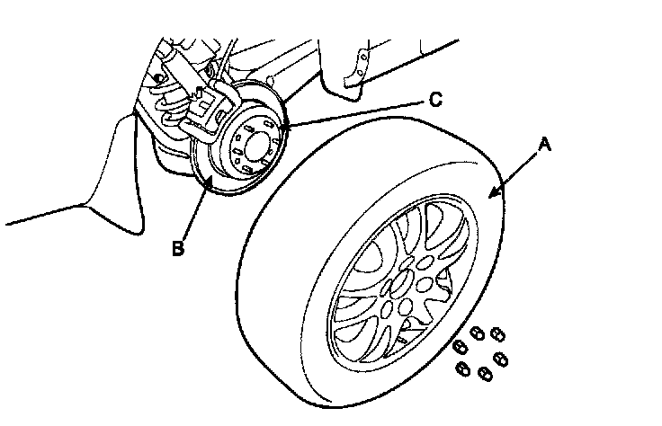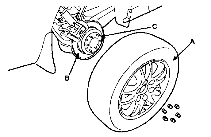 CAUTION: Be careful not to damage the hub bolts (C) when removing the rear wheel and tire (A).