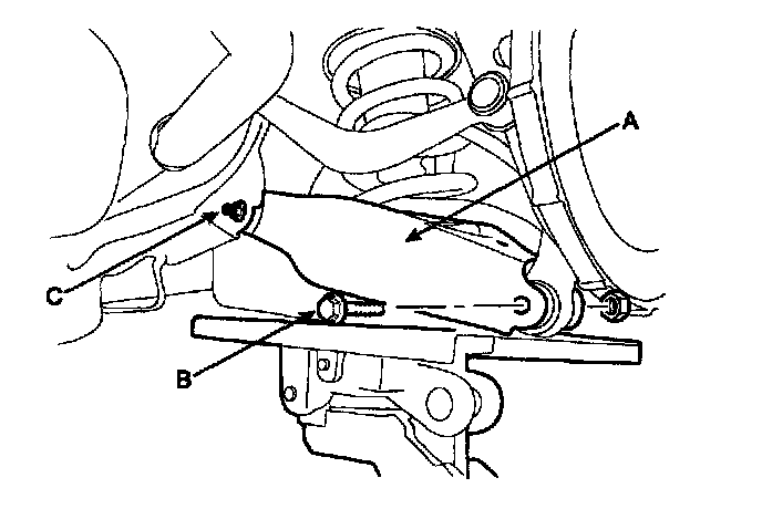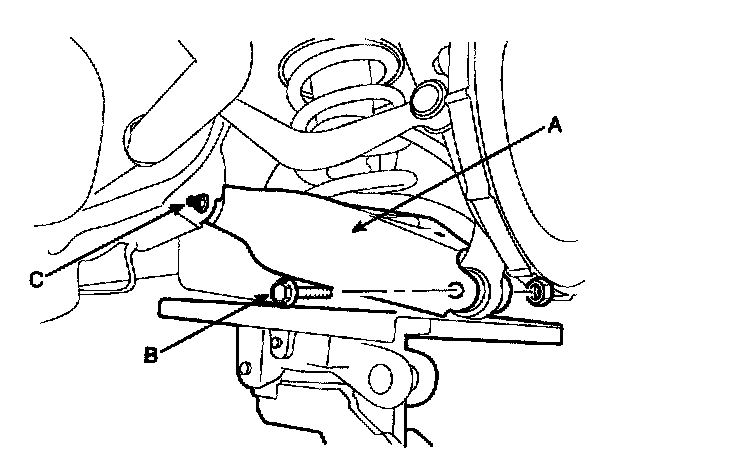 3. Remove the lower arm bolt (B) from the rear knuckle, while supporting the lower arm (A) with a jack as shown in the illustration. Loosen the lower arm bolt (C) from the cross member.