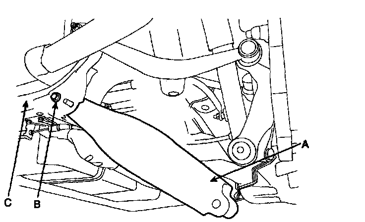 5. Remove the lower arm (A) mounting bolts (B) from the cross member (C).